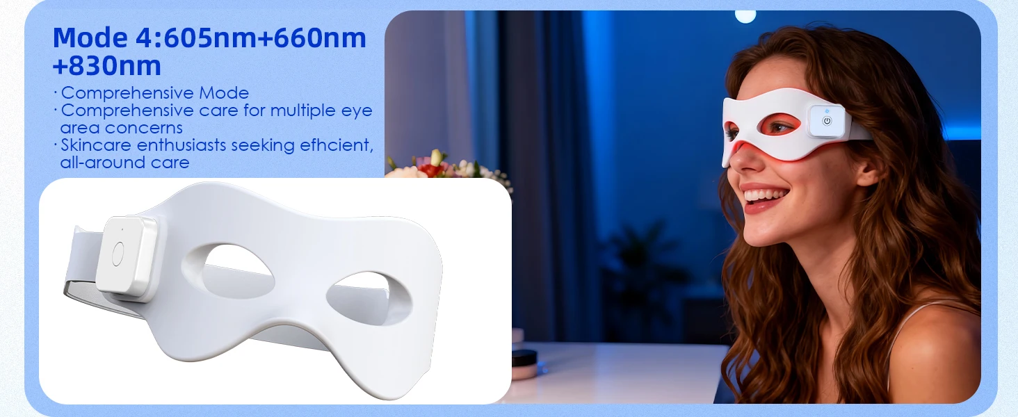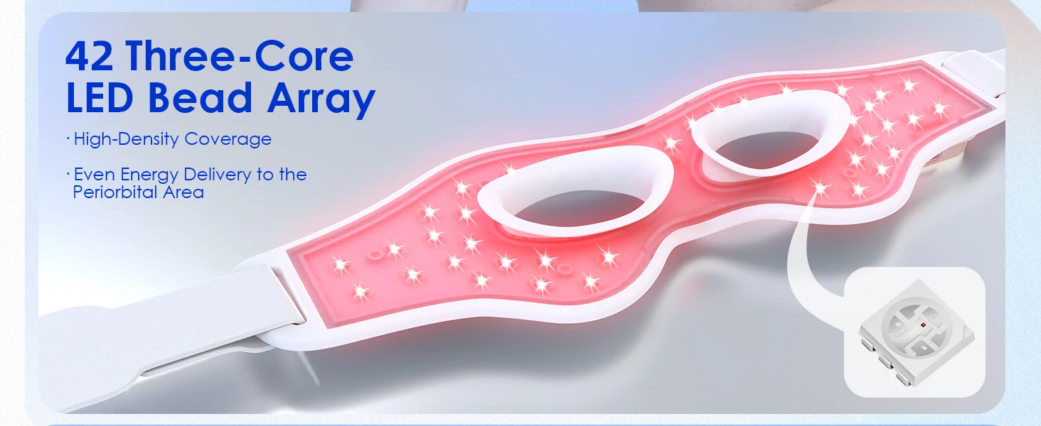 Three-in-one LED Beads: Featuring 42 premium LED beads densely arranged on the eye mask. Each bead integrates 605 orange light, 660nm red light, and 830nm infrared light technology, ensuring uniform coverage across the entire eye area for thorough care without missed spots