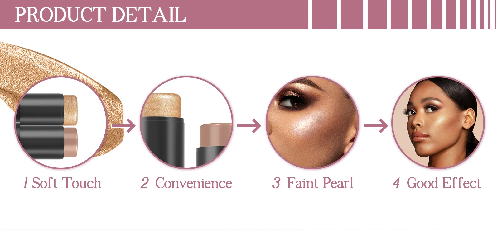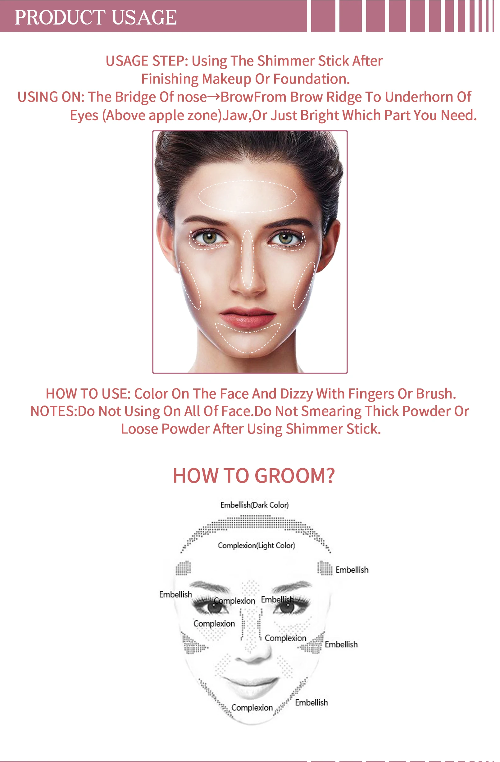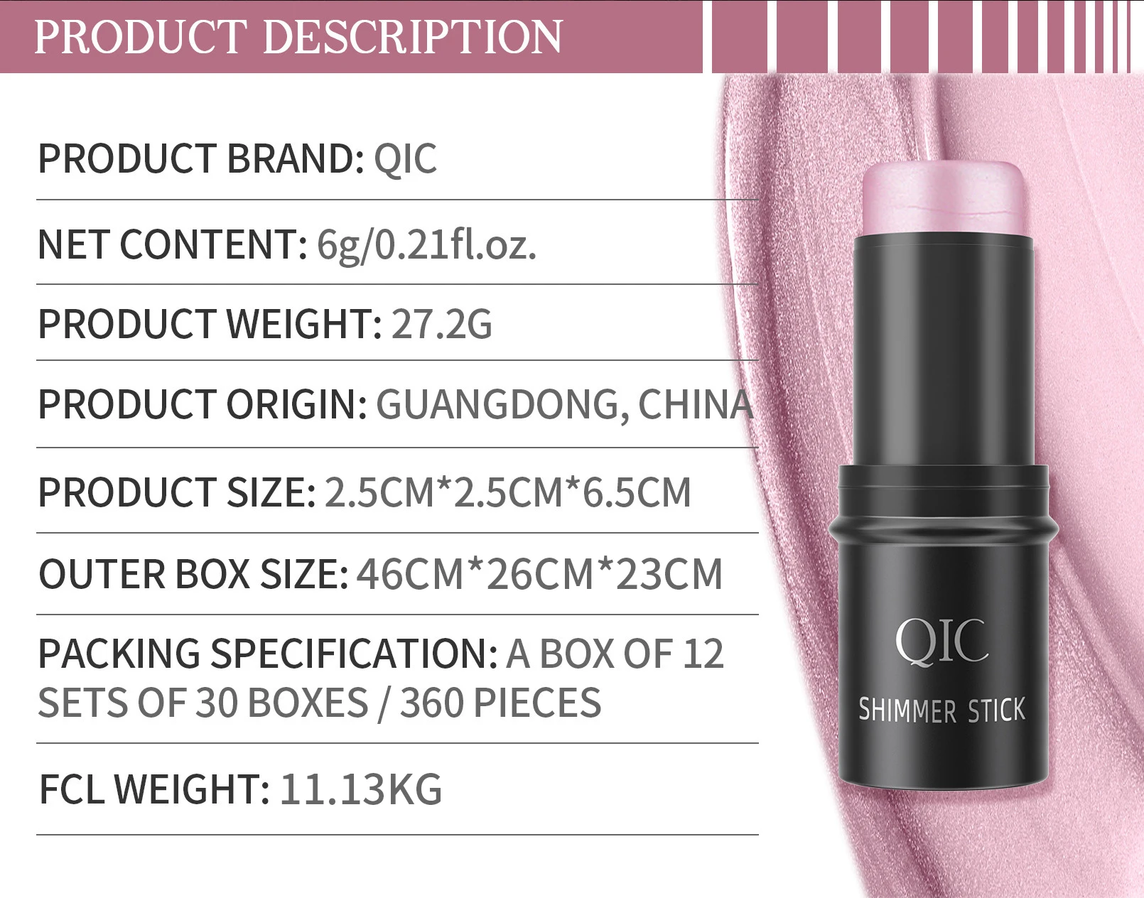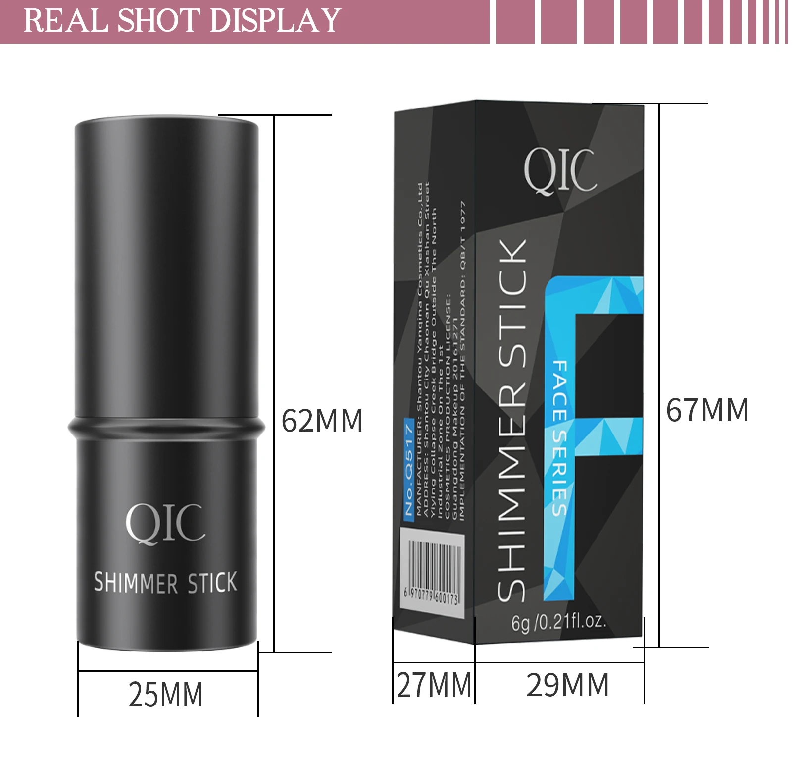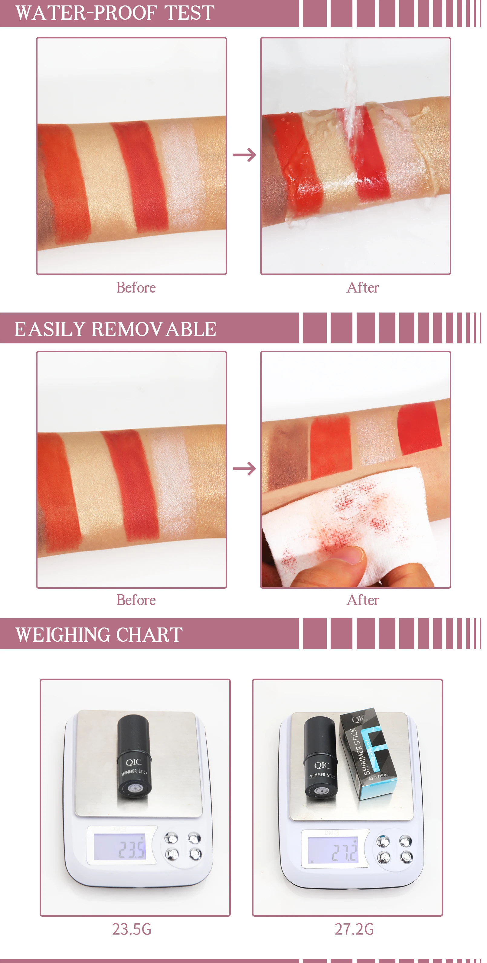 • Highly pigmented:shimmer stick fine pearlescent effect, full color, moderate color, high color.