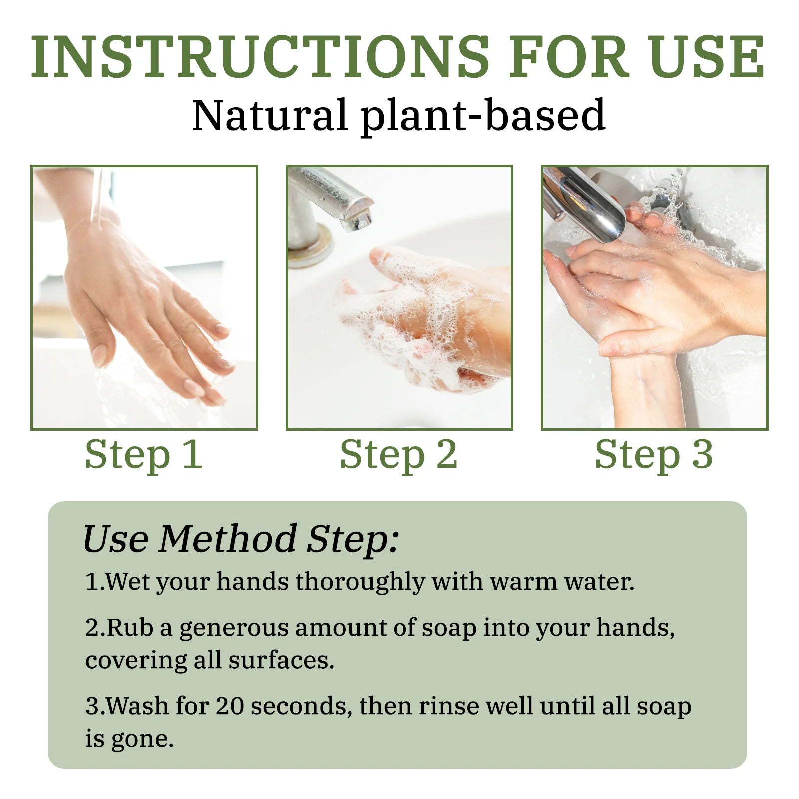 Wet the skin or hands with warm water, rub the soap to create a rich lather, gently massage for 20 seconds, then rinse thoroughly.