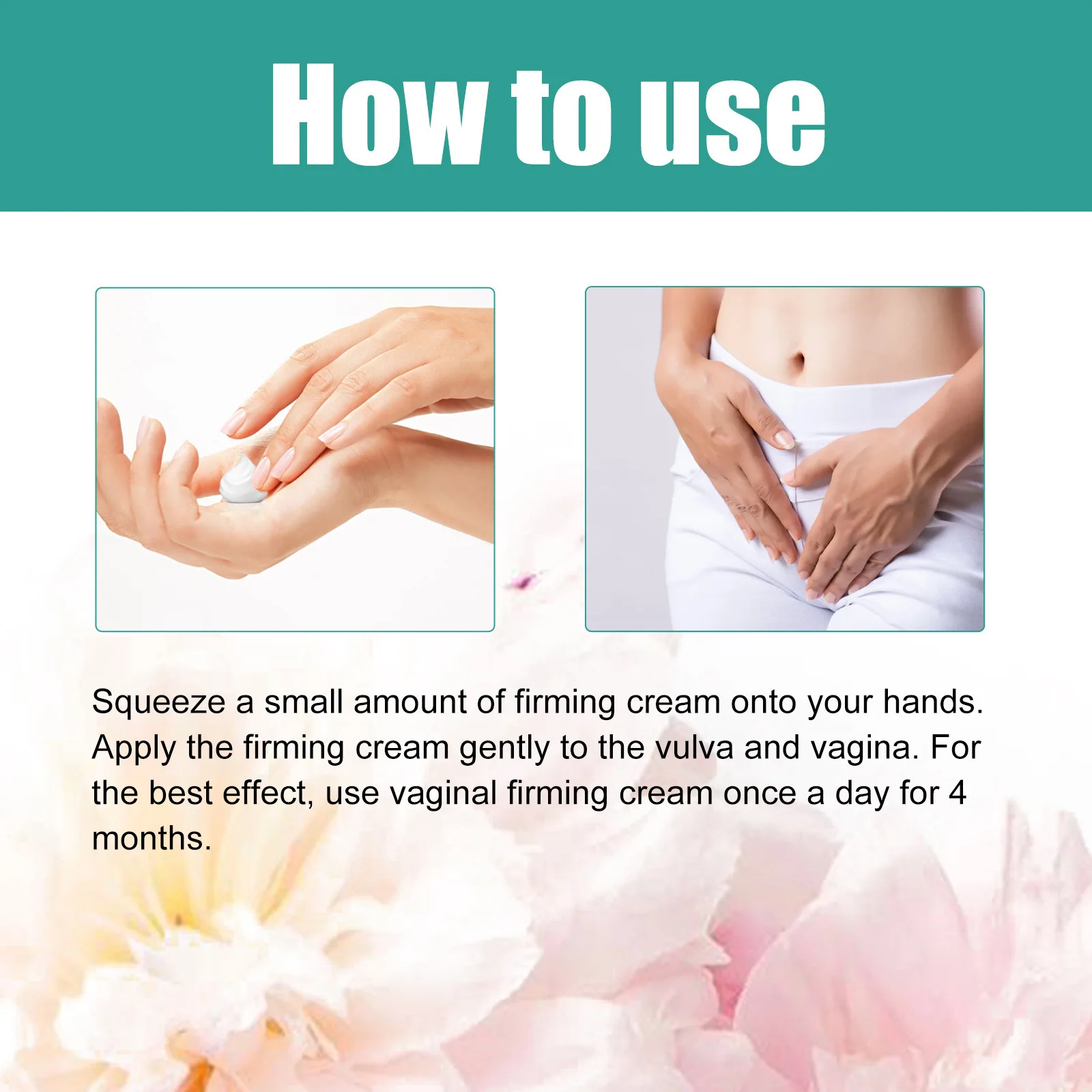 Apply a small amount of firming cream to the palm of your hand, and then gently apply it to the vulva and vaginal area. For optimal results, it is recommended to persist in using it.