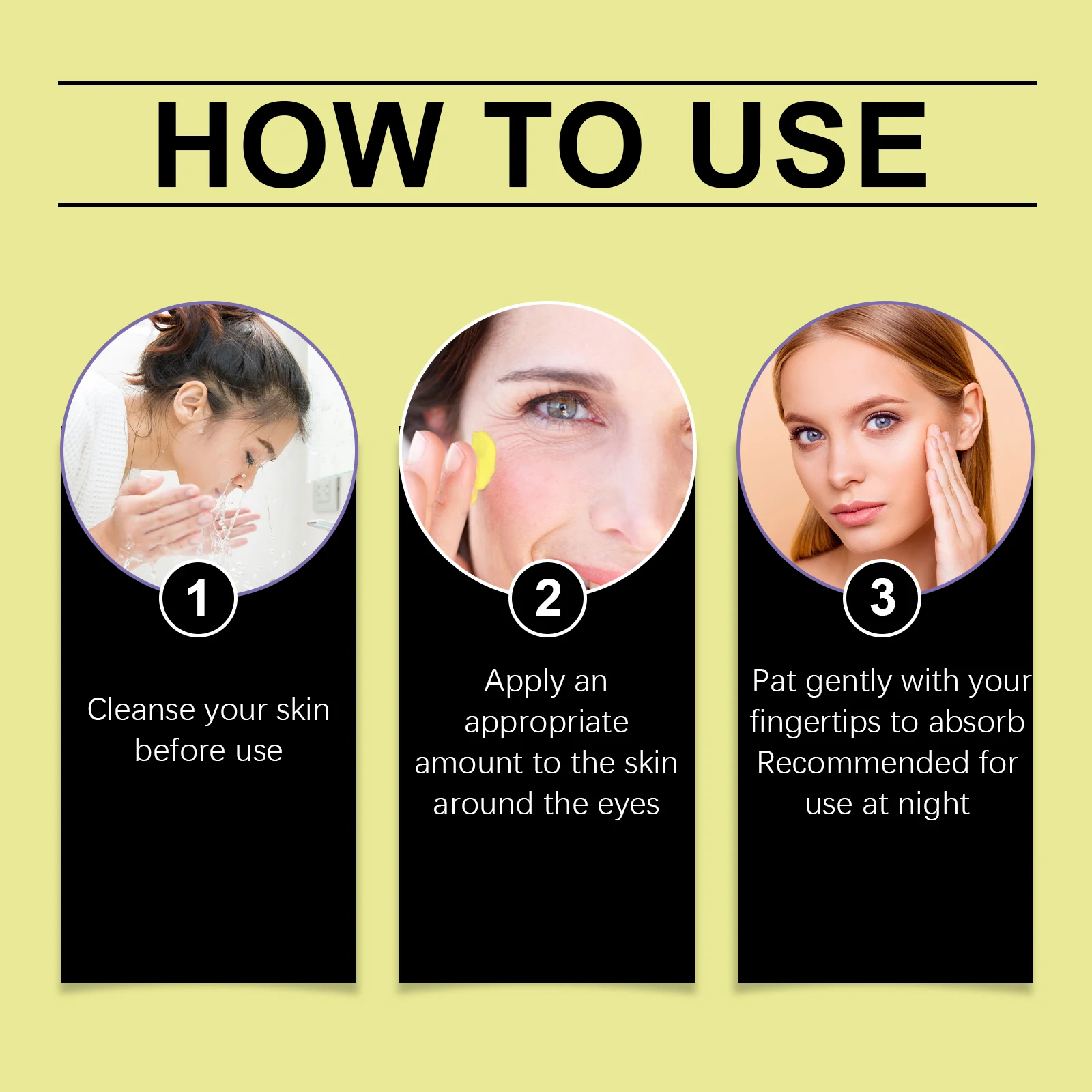 Cleanse your skin before use,apply an appropriate amount to the skin around the eyes,pat gently with your fingertips to absorb,recommended for use at night.